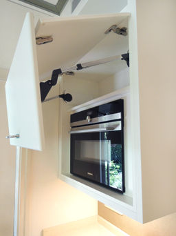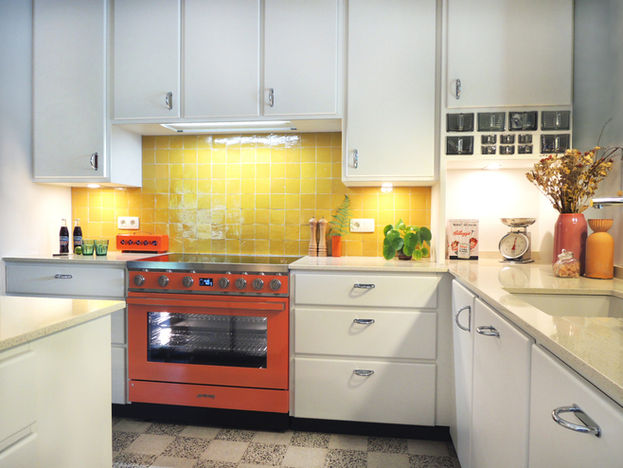 Sfeervolle vintage keuken met oranje Smeg fornuis. Handgeschilderde fronten met afgeronde hoeken. W